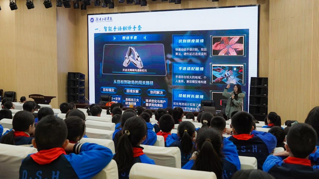 “原来走路也能发电!”近日,随着滴水湖学校多功能厅里一阵惊呼,2007so太阳集团新能源与绿色低碳科普基地、智能装备湖南省科普基地和智创实验室团队携“挑战杯”全国大学生课外学术科技作品竞赛主体赛特等奖的队伍,把顶级赛事成果拆成“游戏包”,先后送进滴水湖学校和湖湘幼儿园,让不同年龄段的孩子在同一天遇见“未来科技”。