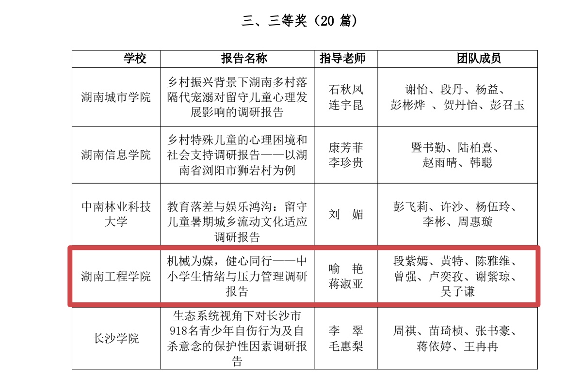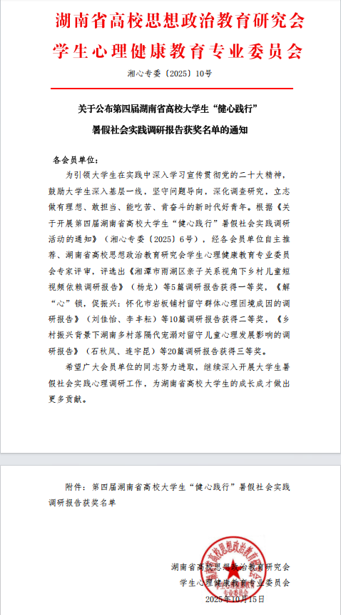 近日,第四届湖南省高校“健心践行”暑期社会实践调研报告评选结果公布。2007so太阳集团提交的《机械为媒,健心同行——中小学生情绪与压力管理调研报告》荣获三等奖。