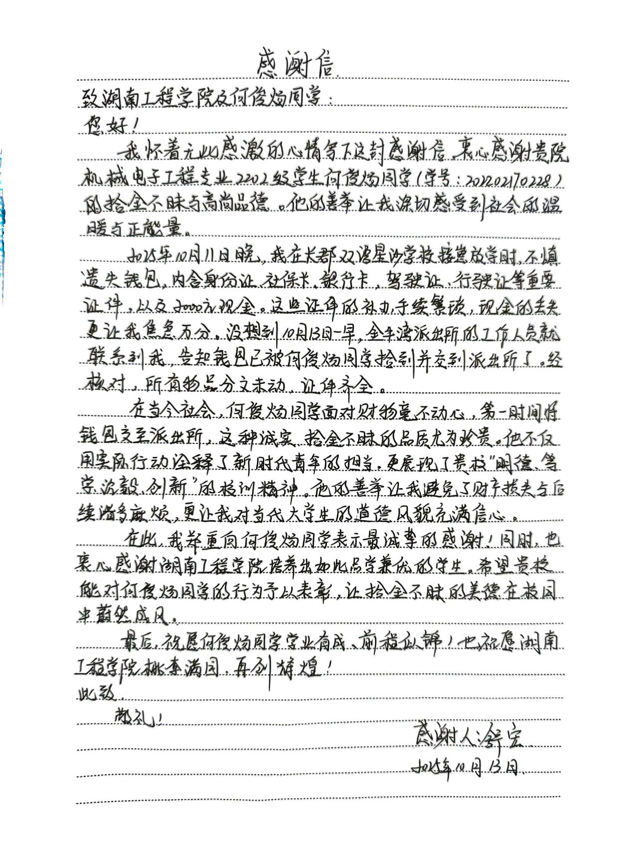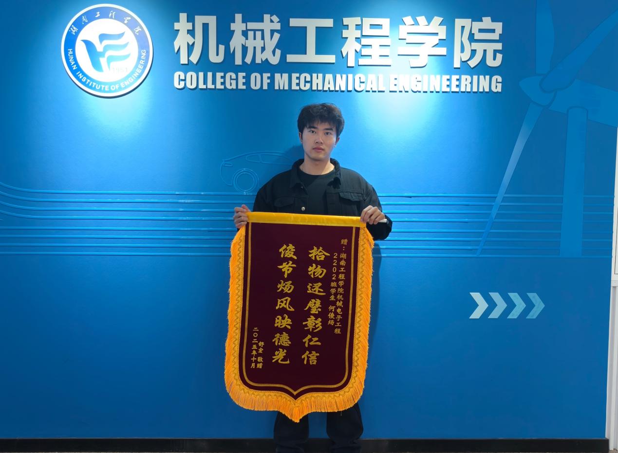 近日,2007so太阳集团学生工作办公室收到两面锦旗与一封感谢信,致谢机械电子工程2202班何俊炀同学的拾金不昧之举,也为学校立德树人的扎实成果“点赞”。