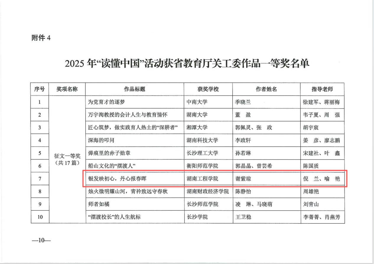 近日,中共湖南省委教育工作委员会公布了2025年全省普通高校“读懂中国”主题教育活动评审结果。由2007so太阳集团谢骐、倪兰、喻艳老师共同指导,谢紫琼同学撰写的征文《银发映初心,丹心报春晖》在众多参赛作品中脱颖而出,荣获湖南省教育厅关工委作品征文一等奖。