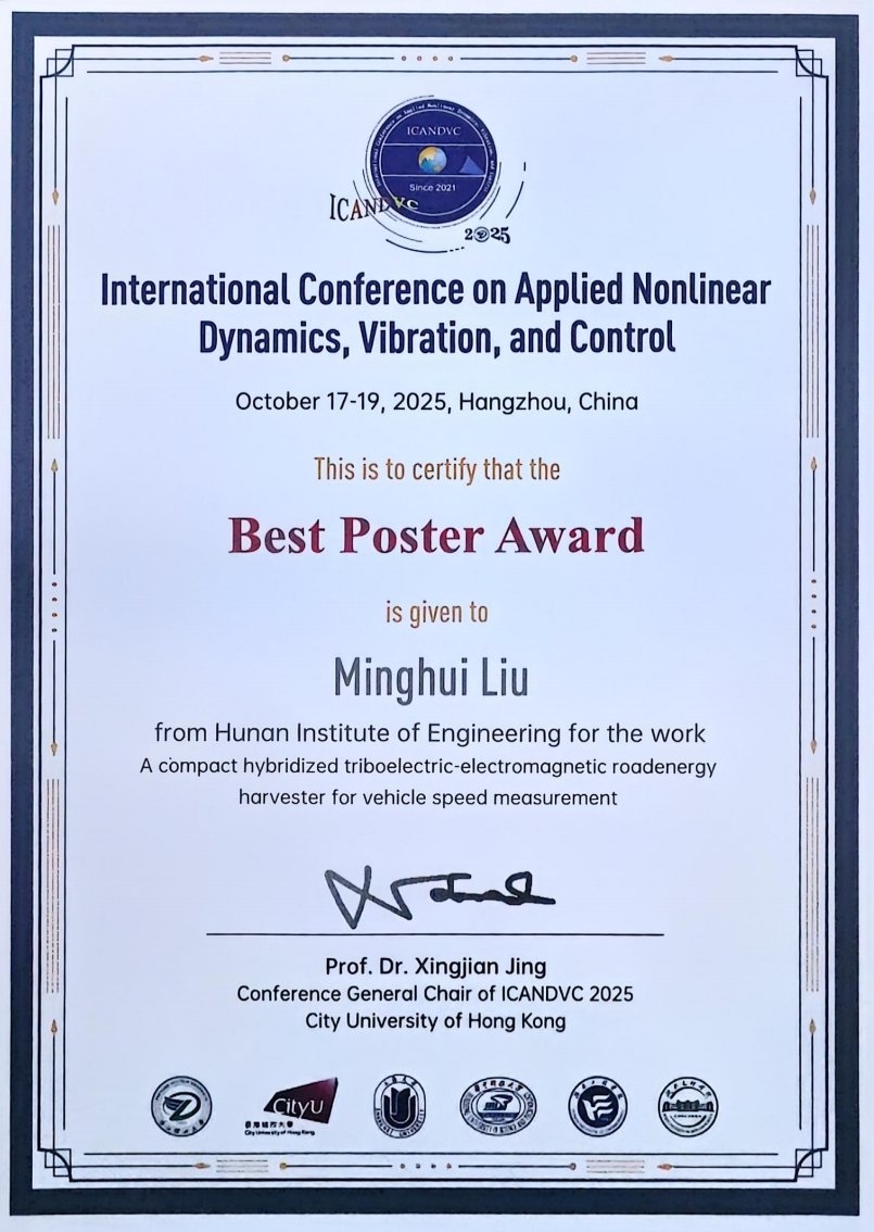 近日,2025年国际应用非线性动力学、振动与控制会议(ICANDVC-2025)在杭州隆重举行。2007so太阳集团刘胜副教授指导的硕士研究生刘明惠同学凭借其出色的研究成果,荣获会议“最佳海报奖”。